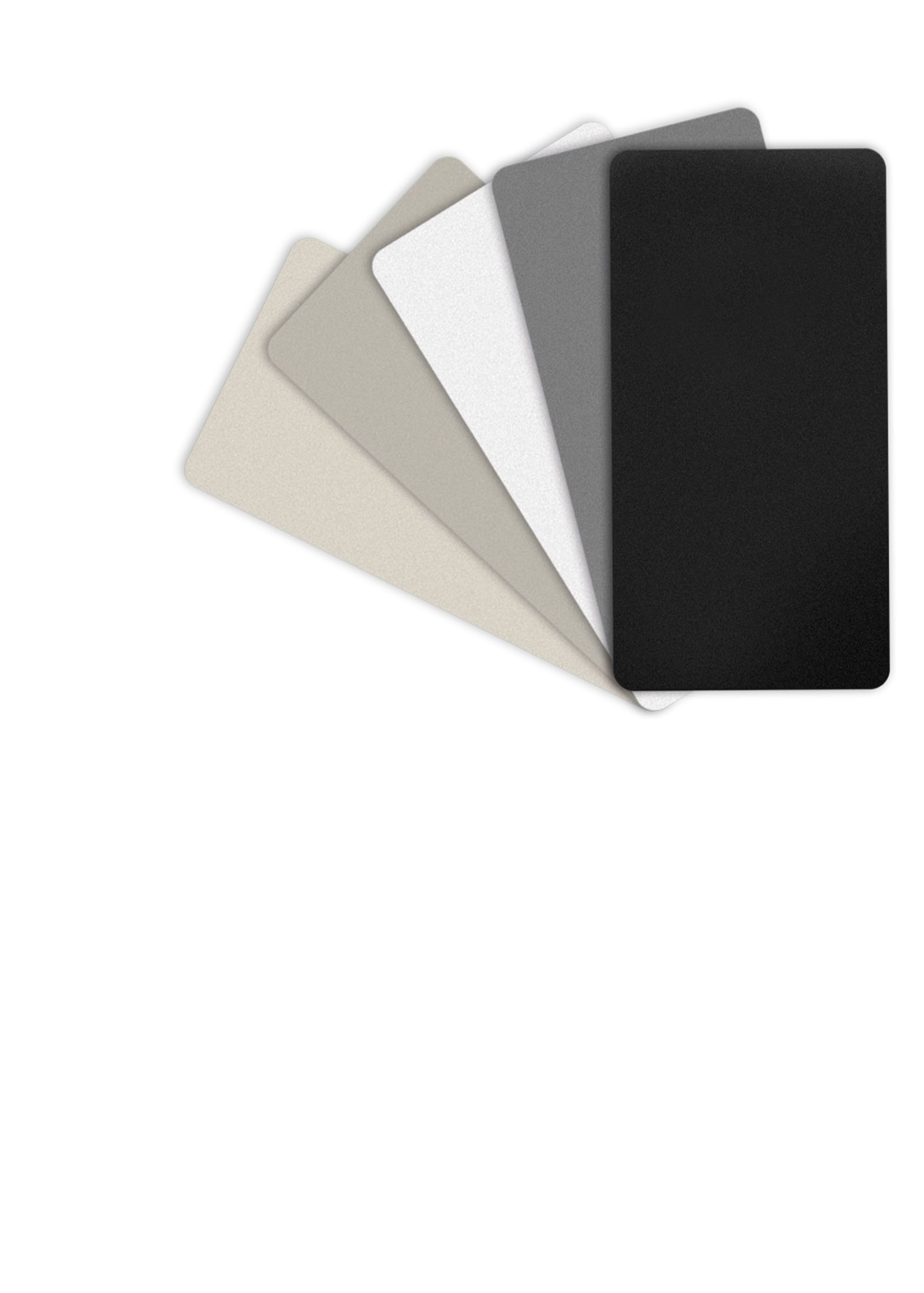 Hochwertig pulverbeschichtete Oberflächen verleihen dem Möbel eine edle Anmutung und eine angenehme, samtige Haptik. Die widerstandsfähige Beschichtung sorgt zugleich für Langlebigkeit und Pflegeleichtigkeit im täglichen Gebrauch. Farben und Strukturen sind frei wählbar und können präzise auf das jeweilige Raumkonzept abgestimmt werden. Hier ein Auszug unserer Auswahl.