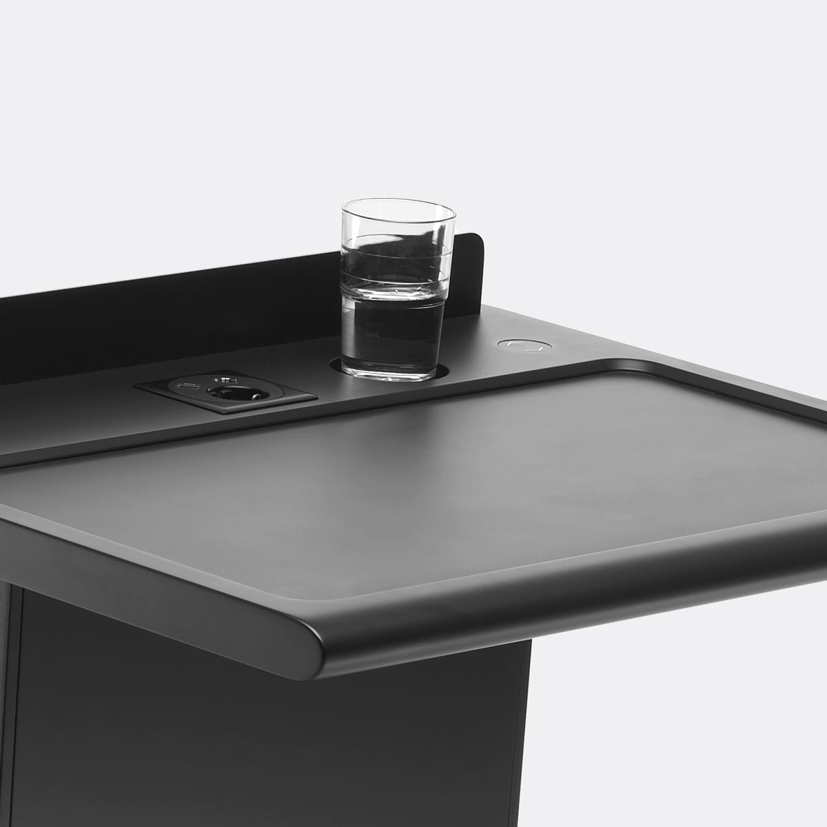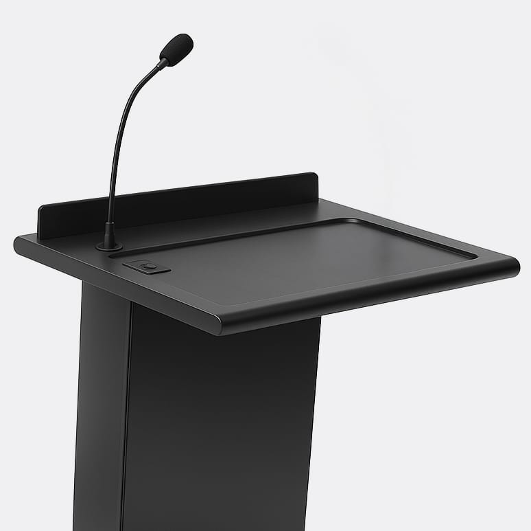 Klare Formensprache mit präziser Linienführung . Höhenverstellbar für ergonomisches Arbeiten . Abnehmbare Frontverkleidung für Technikanschlüsse . Integrierte Mikrofonie mit eleganter Kabelführung . Pulverbeschichtete Oberfläche – langlebig und samtig im Griff.