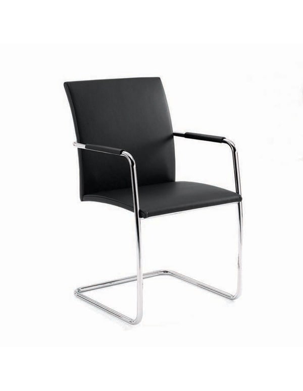 Nach unten verjüngtes verchromtes geschwungenes Stahlrohr. Abgesetzte Gleiterelemente verschaffen bei Sideboards und Tisch eine zarte Optik. Kabelführungen erstrecken sich entlang der Gestellform nahezu unsichtbar.